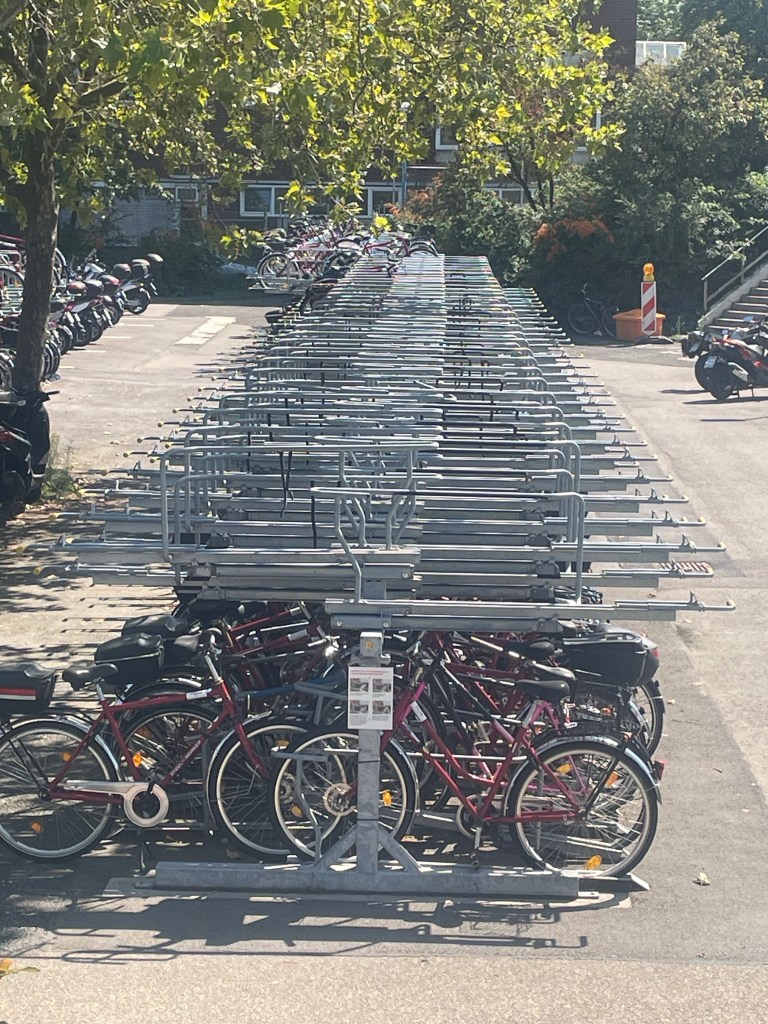 Internal transport systems include buses, trains and a fleet of red cycles with silver mudguards.